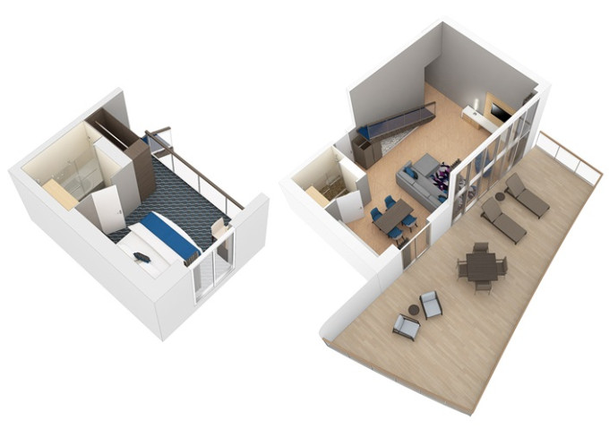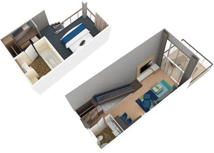 | L1 - Crown Loft Suite od 68,5 m² + balkón 13 m². 2-podlažný apartmán. 17. paluba. Max 4 osoby. Výhody Royal Suite Sky Class. | 8 726 € 4 363 € za osobu | ||