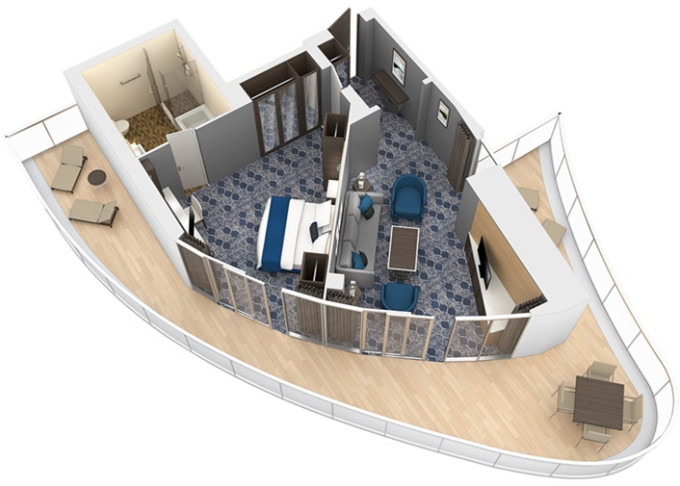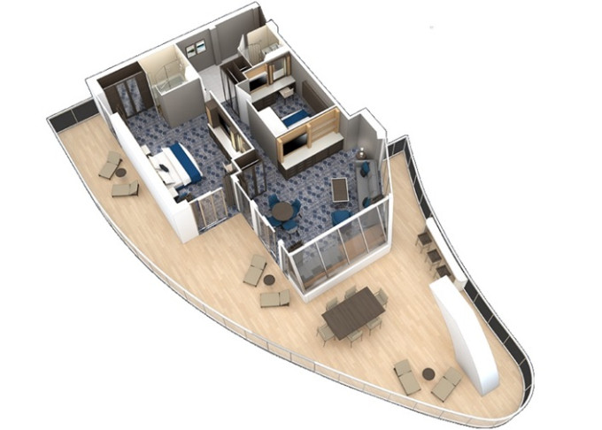 | A3 - Spacious AquaTheater 52 m² + balkón 55 m². Max 4 osoby. Výhody Royal Suite Sky Class. | 9 398 € 4 699 € za osobu | ||