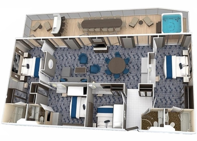 | A1 - Spacious AquaTheater Suite / 2 spálne 76 m² + balkón 72 m². 8. paluba. Max 8 osôb. Výhody Royal Suite Star Class. | 19 488 € 6 496 € za osobu | ||